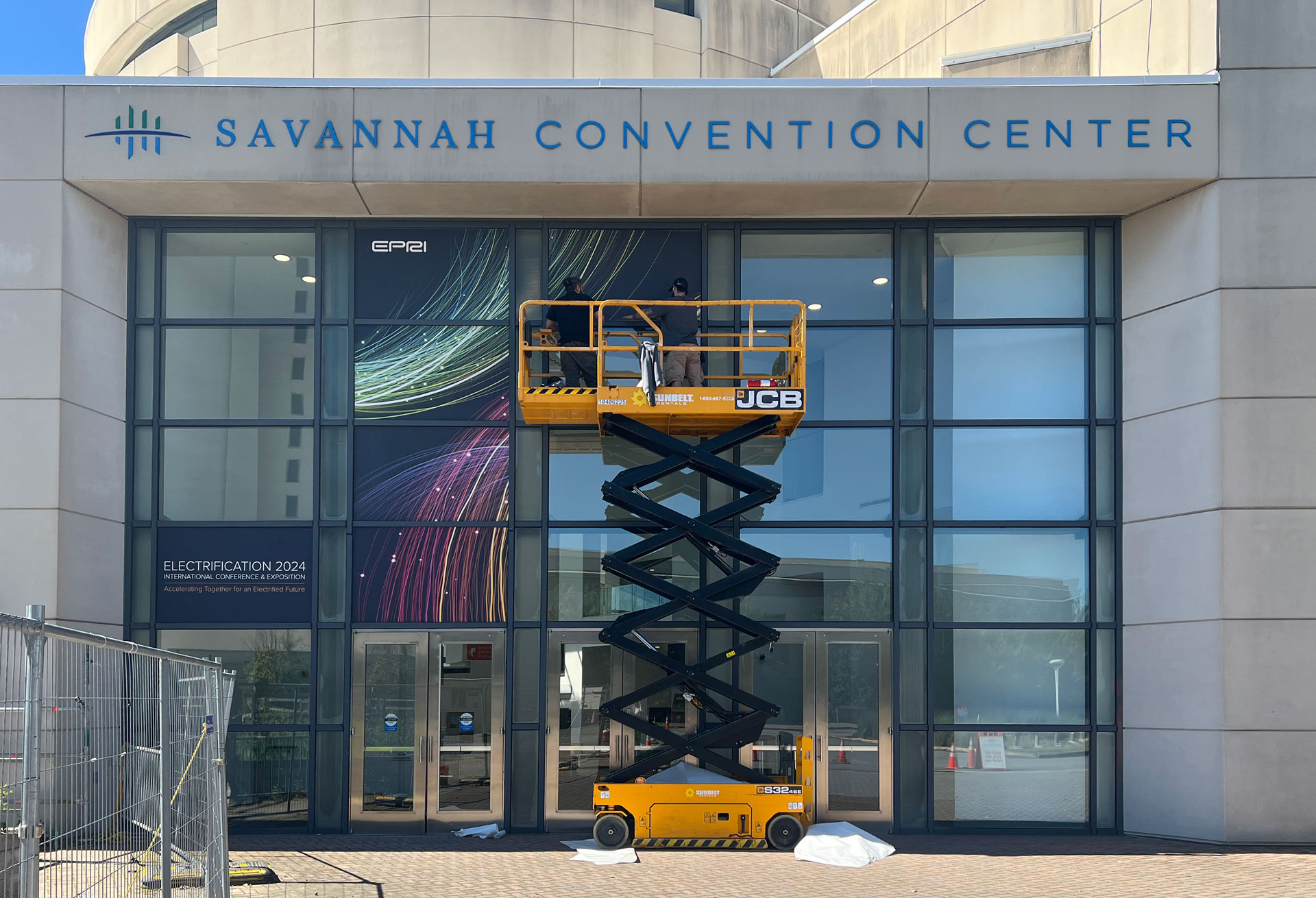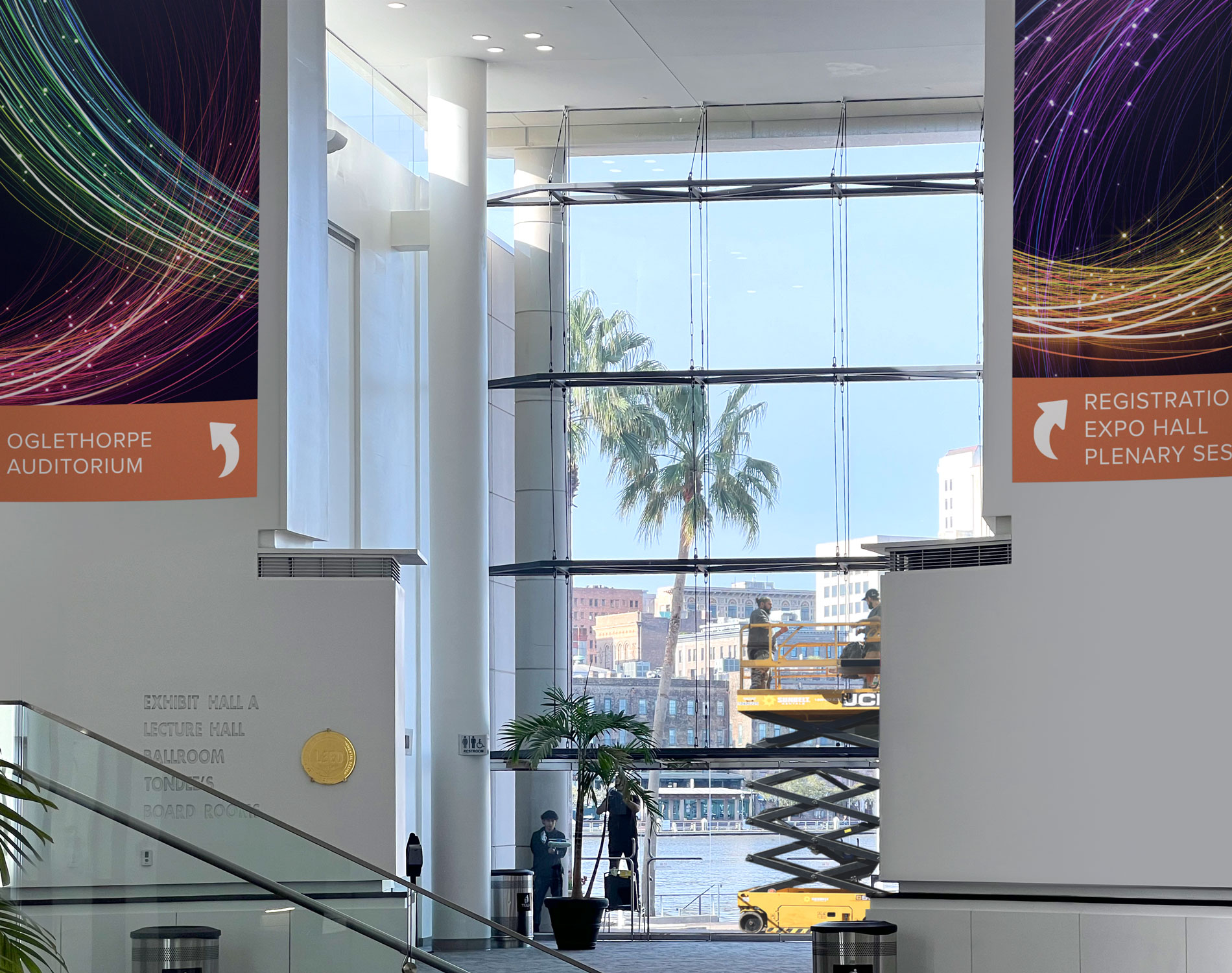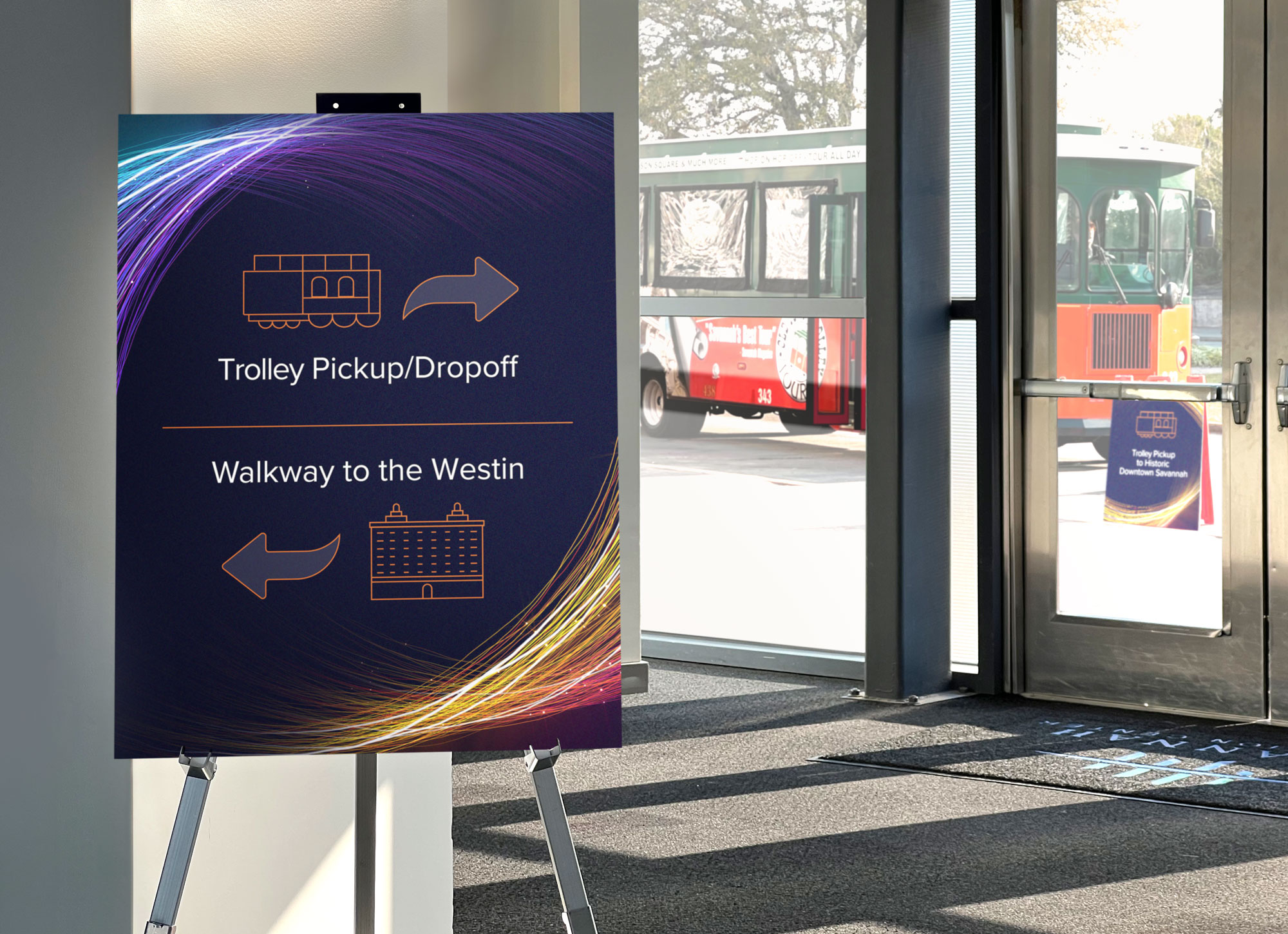 All roads led to the main entrance at the Savannah Convention Center. Depending on what side of the river attendees or exhibitors stayed, the way to the conference was by ferry, via trolley or on foot. This required a variety of wayfinding signage to make their paths easy and clear.