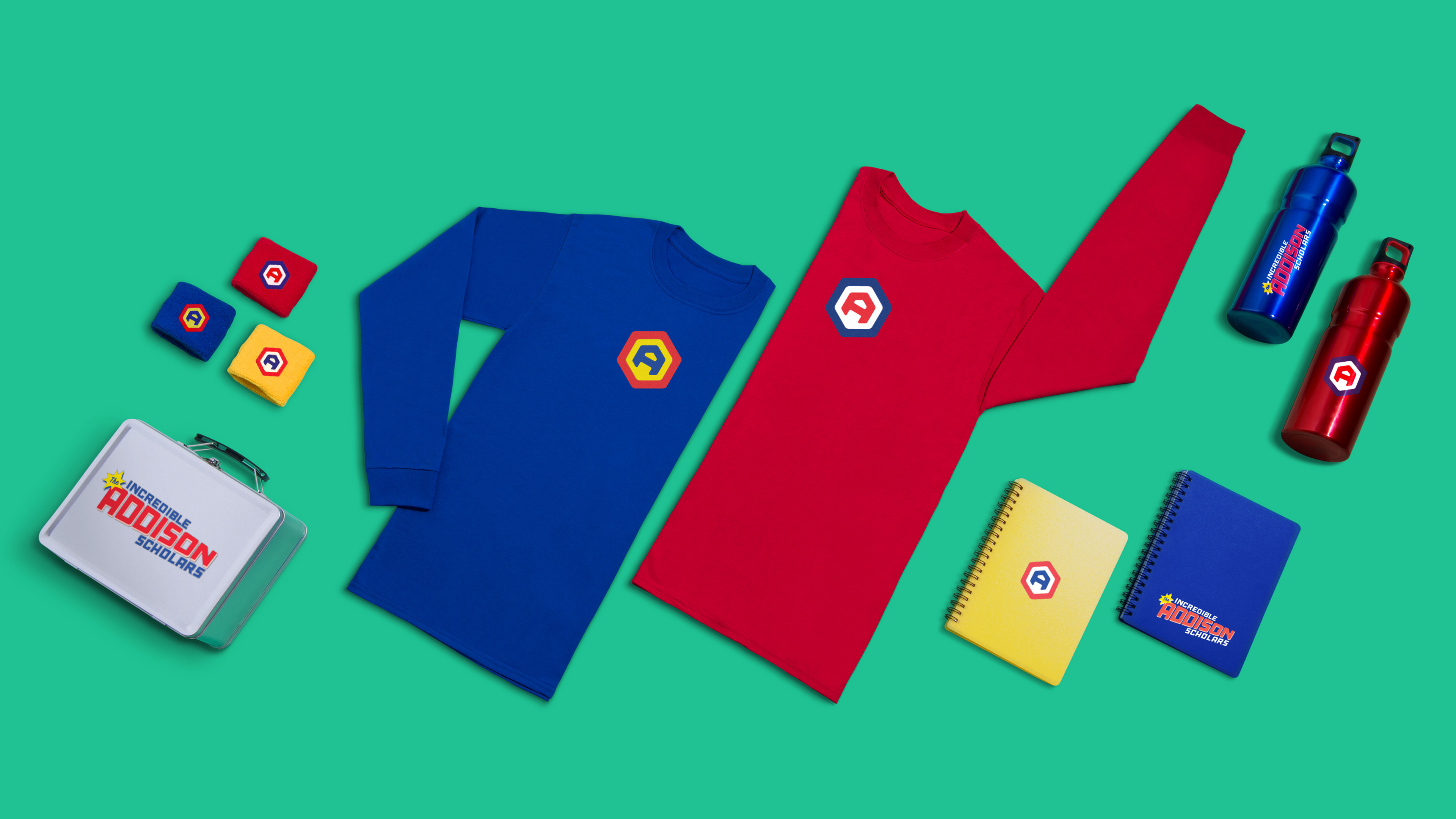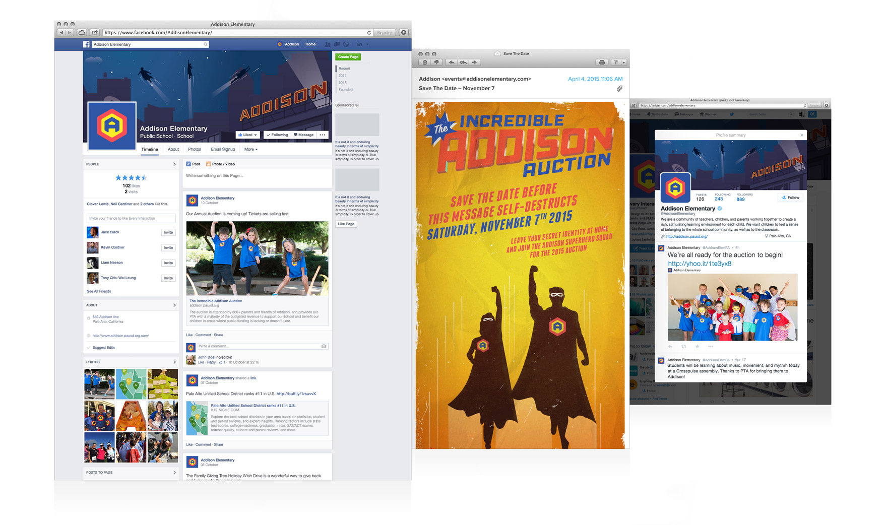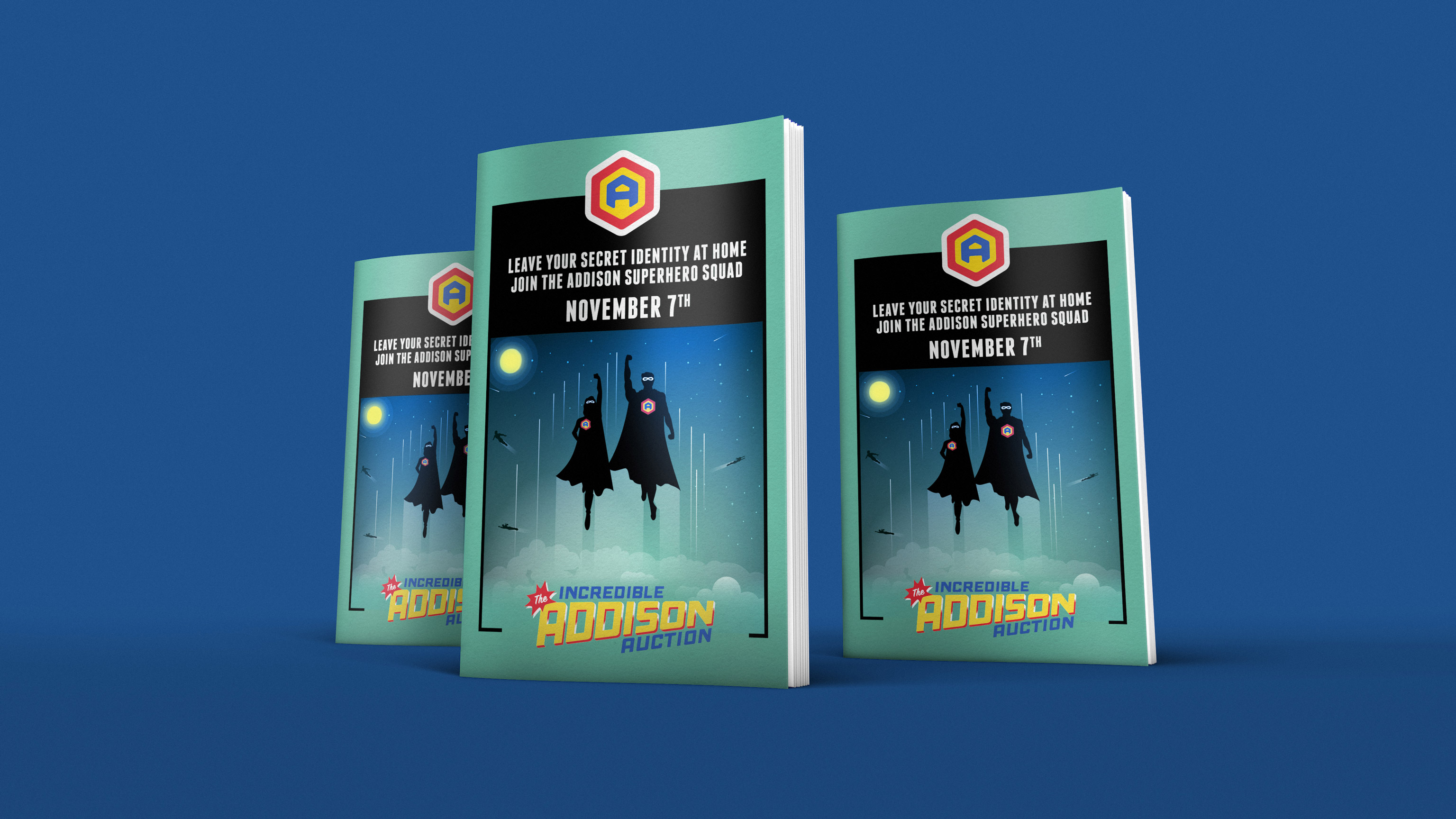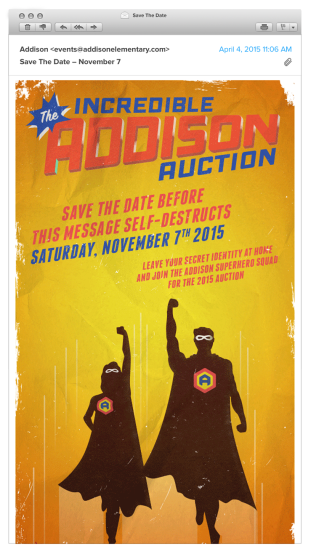 Based on a superhero theme, we created an identity for Addison Elementary School’s annual fundraising auction, our pay-it-forward project for this year. The bright primary colors and fresh design approach were just what was needed to achieve powerful participation for the incredible event. And then Whoosh! The logo design morphed into ever-more adventurous projects befitting our heroic agents of education.