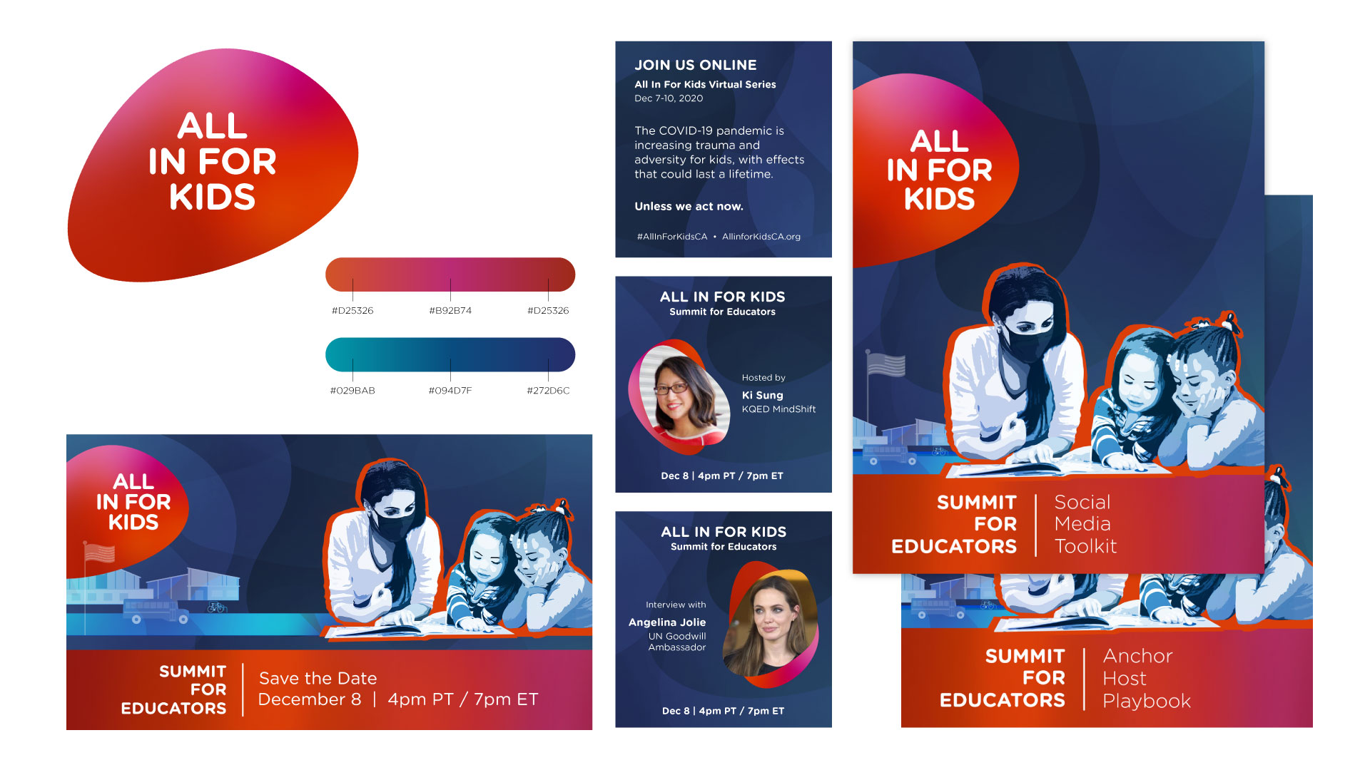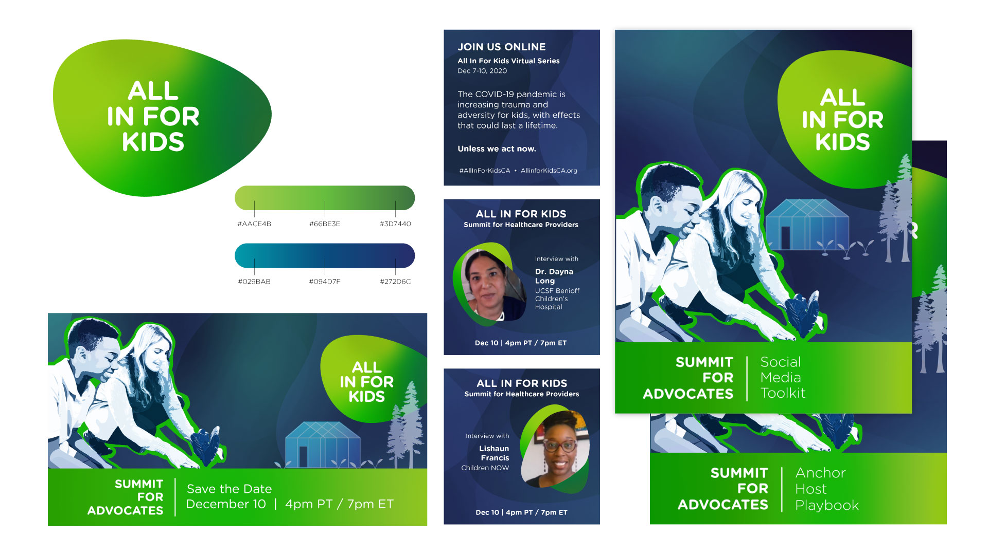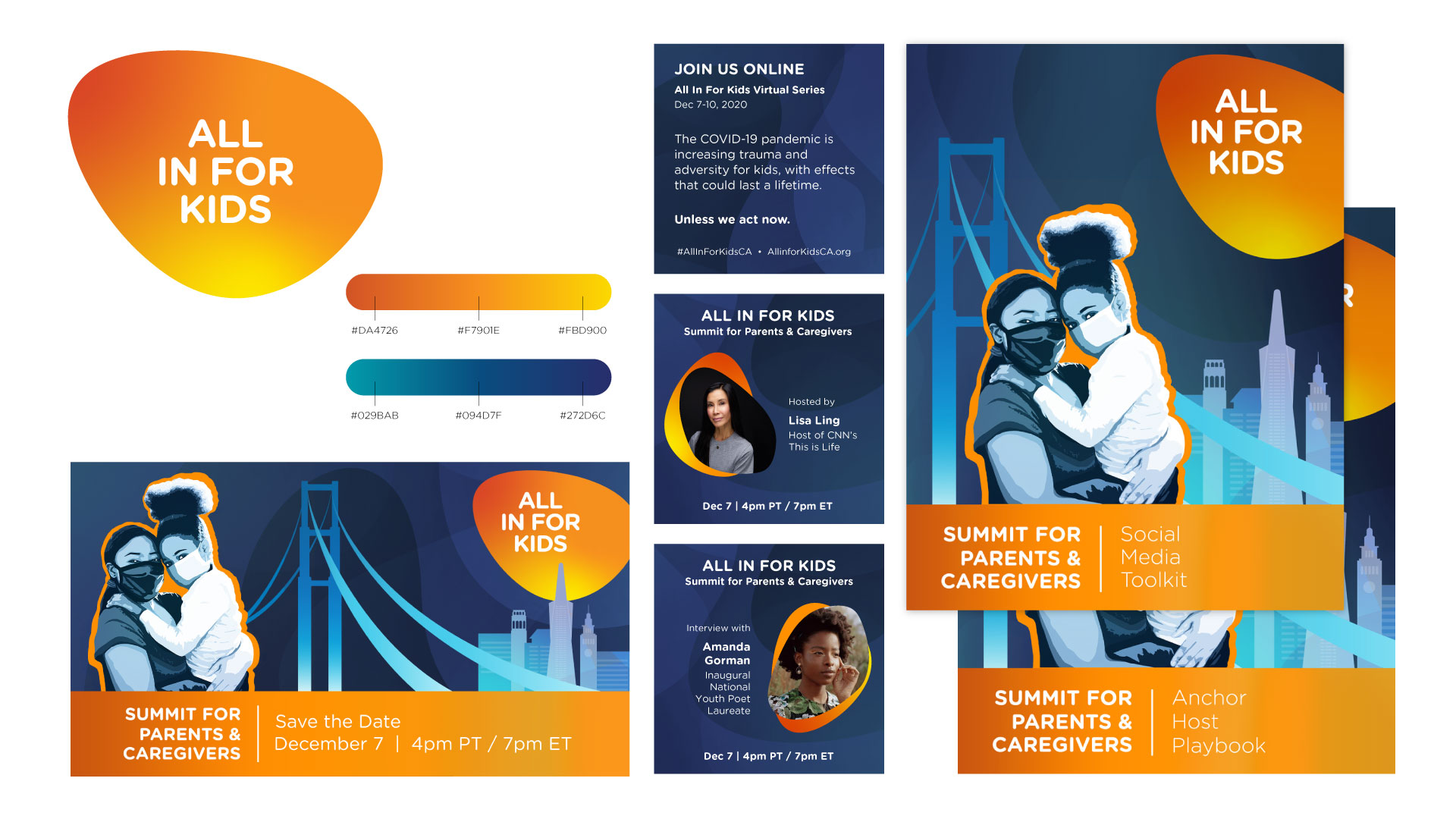 Research shows that traumatic stress during childhood can harm child development, resulting in higher rates of life-threatening diseases over time. Futures Without Violence (FWV) has always supported Bay Area communities in preventing adverse childhood experiences. Sadly, COVID-19 has exacerbated these challenges with a disproportionate impact on communities of color. To help families cope, FWV secured seed funding from Genentech and created All In For Kids, a series of virtual summits raising awareness and urgency for this public health crisis. With design inspired by community murals, the event featured a star-studded lineup of healthcare professionals, journalists, and artists giving advice, solutions, and wellness tips to help everyone address this global experience.