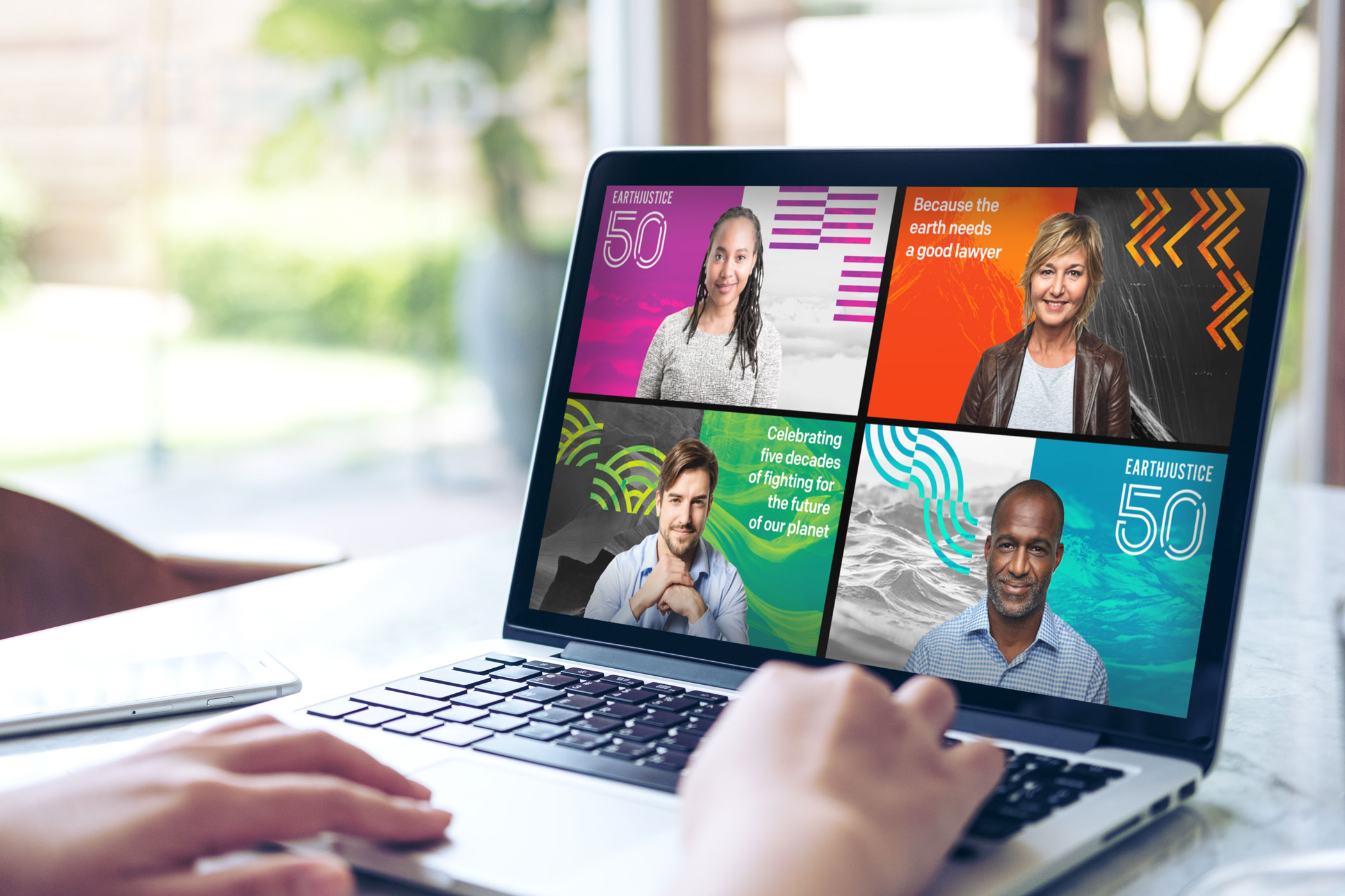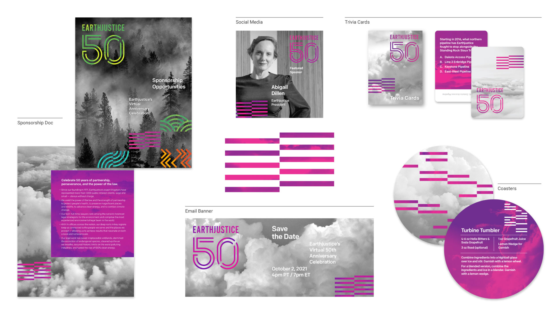 Earthjustice held a hybrid event, commemorating their five decades of fighting for the future of the planet. Hosting the anniversary online allowed guests from around the world to join the celebration. House parties around the country allowed for small gatherings to enjoy the event safely together. To brand this milestone, we returned to the building blocks of nature, using the four elements as an overarching theme.