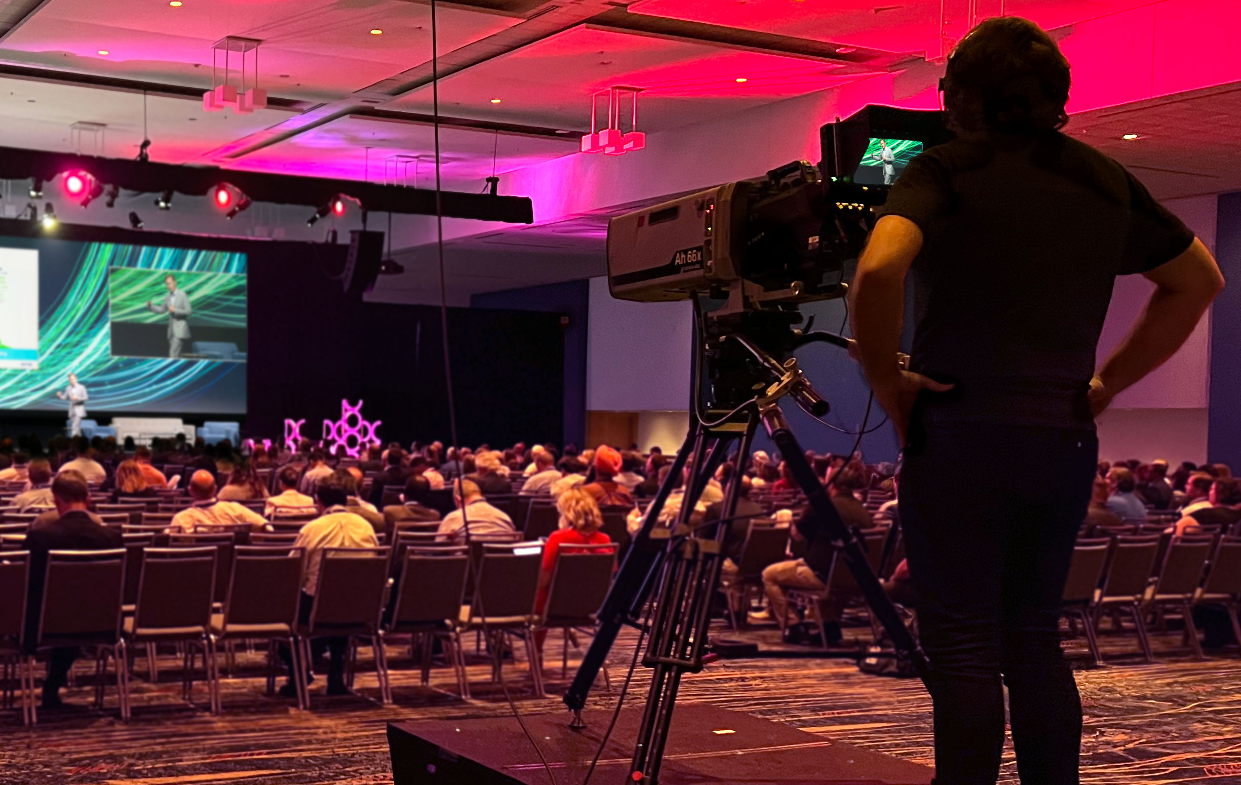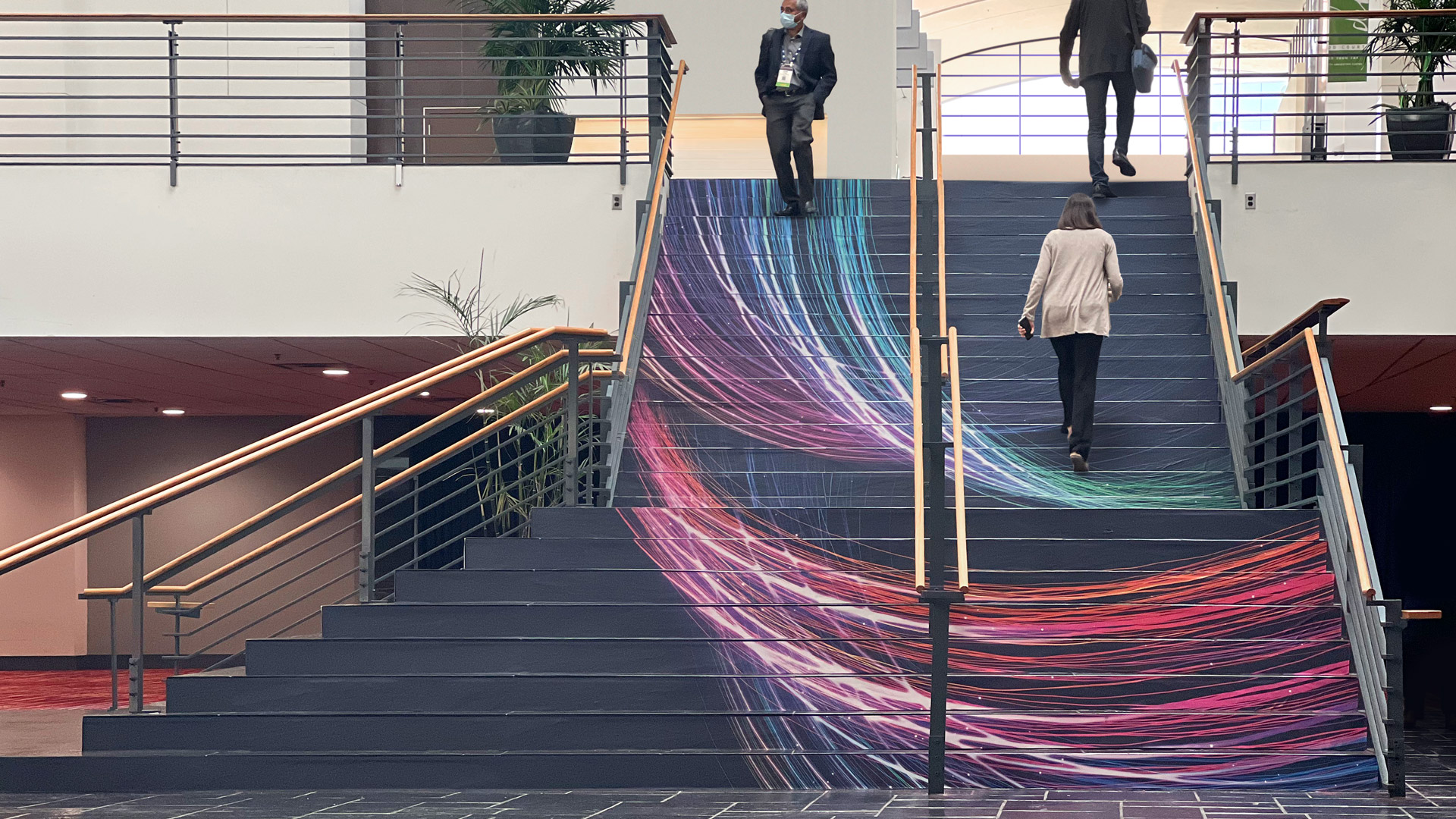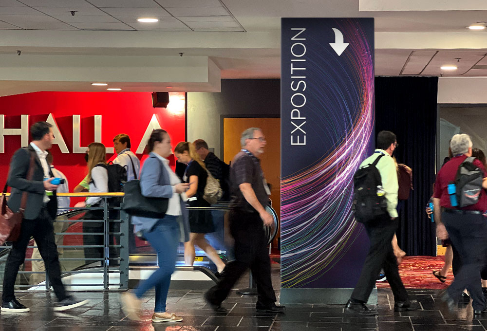 An animated loop of the event branding as well as backdrops for speaker presentations was created for the 48-foot wide display in the plenary session hall.