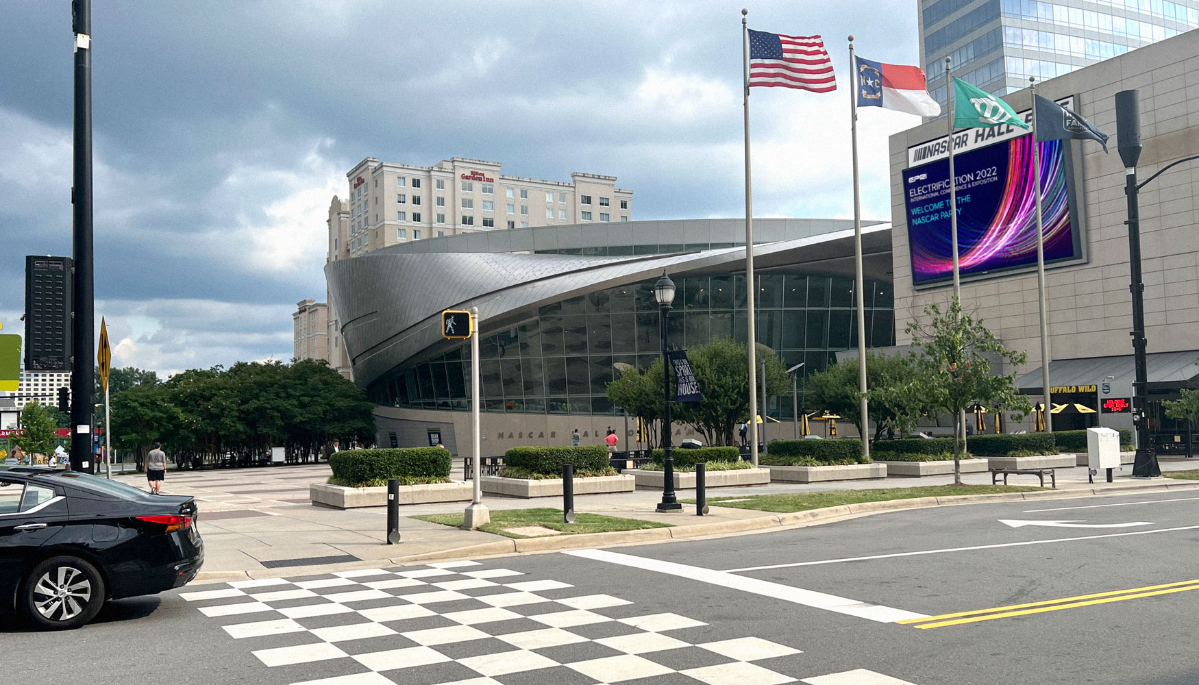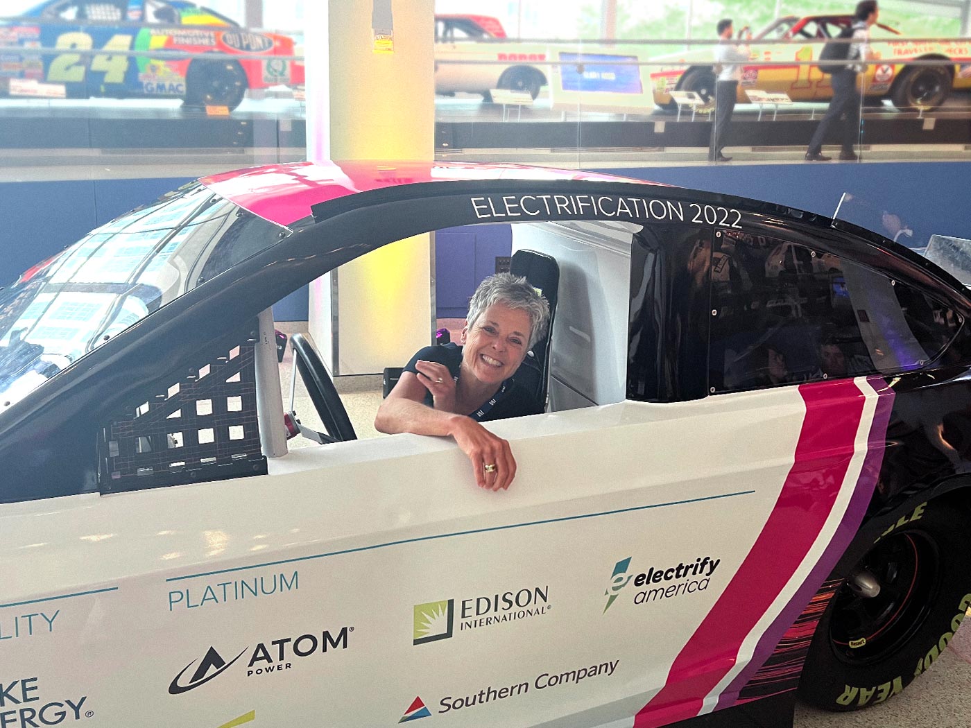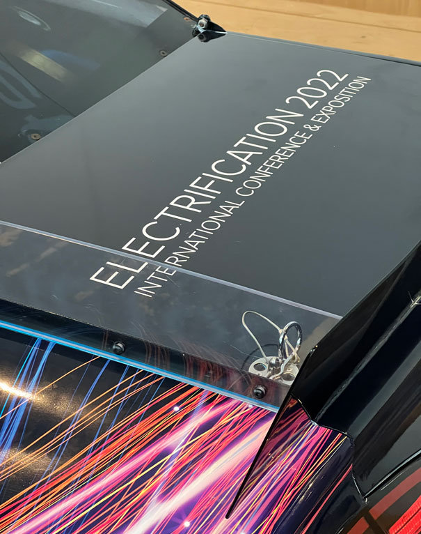 One highlight of the expo was the welcome party at the NASCAR Hall of Fame across the street from the Convention Center. We used branding opportunities throughout the venue to tie it to Electrification 2022. The hall was full of fun driving related games, from a timed tire change to a video game car race simulated inside of an actual race car. People had so much fun, the party lasted well past the scheduled closing time.