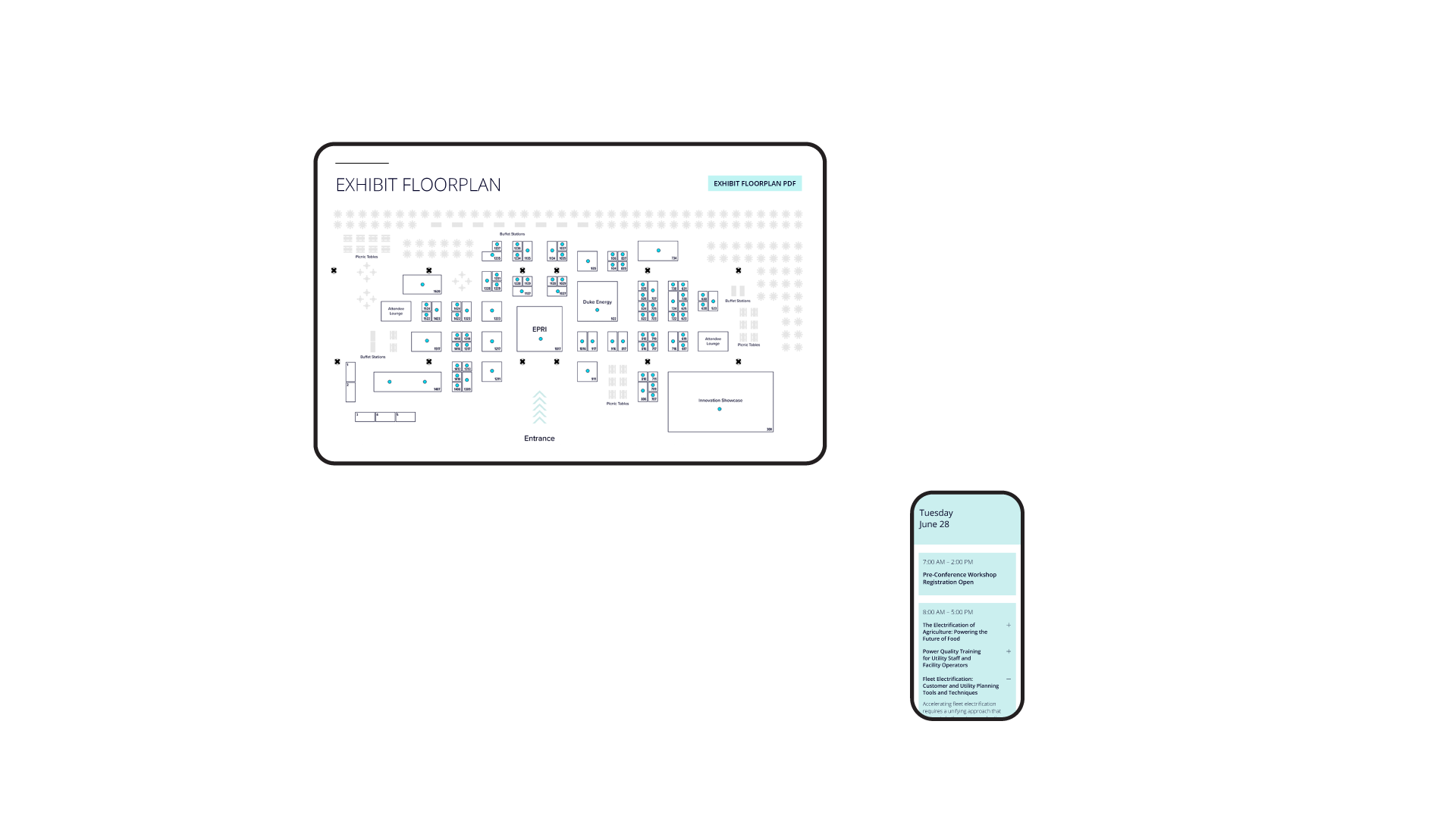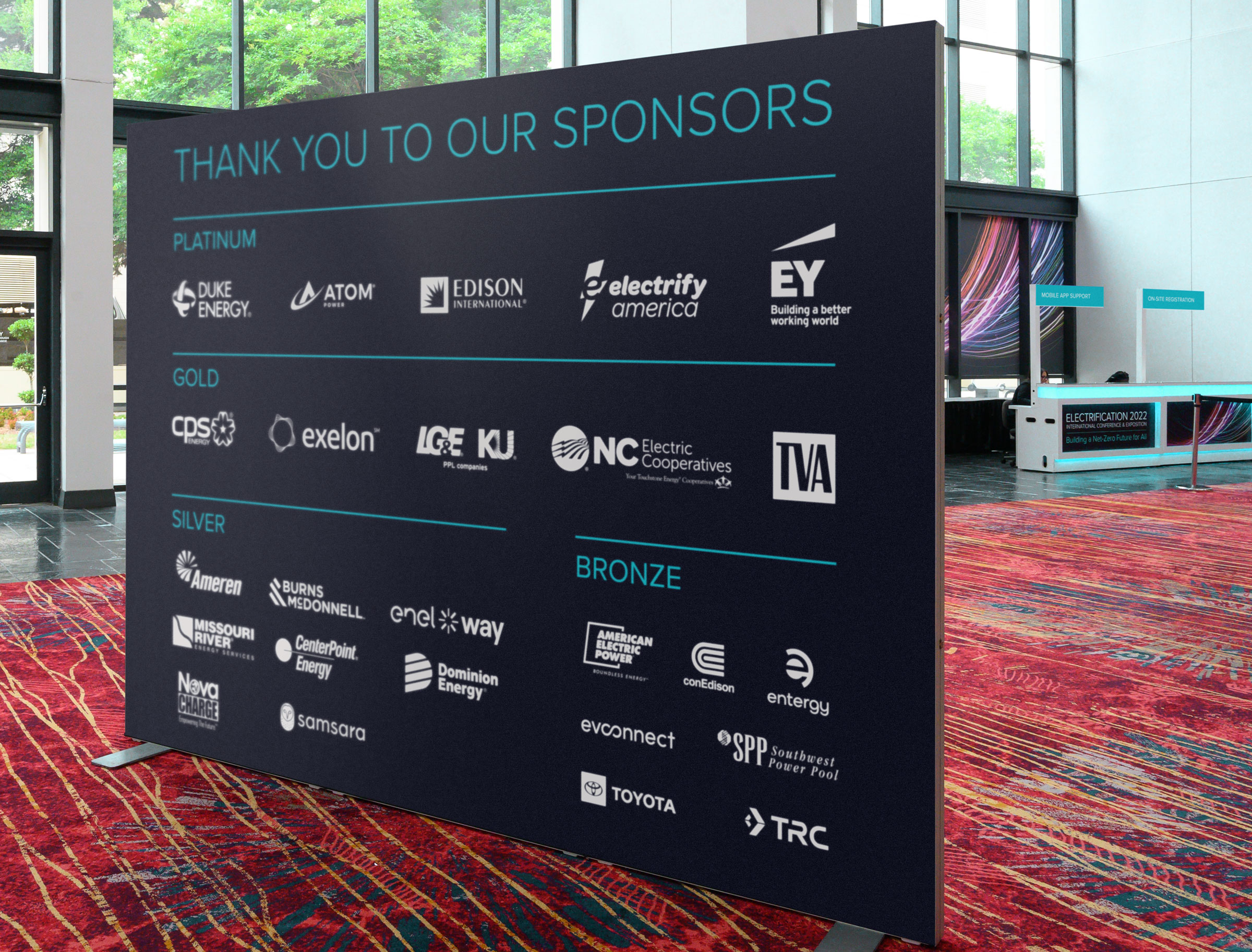 We repurposed mailing boxes custom designed with the Electrification branding to showcase all of the different sponsors. The cubes were grouped in two locations of the convention center — one leading to the plenary sessions and the other at the entry of the main exhibit hall.