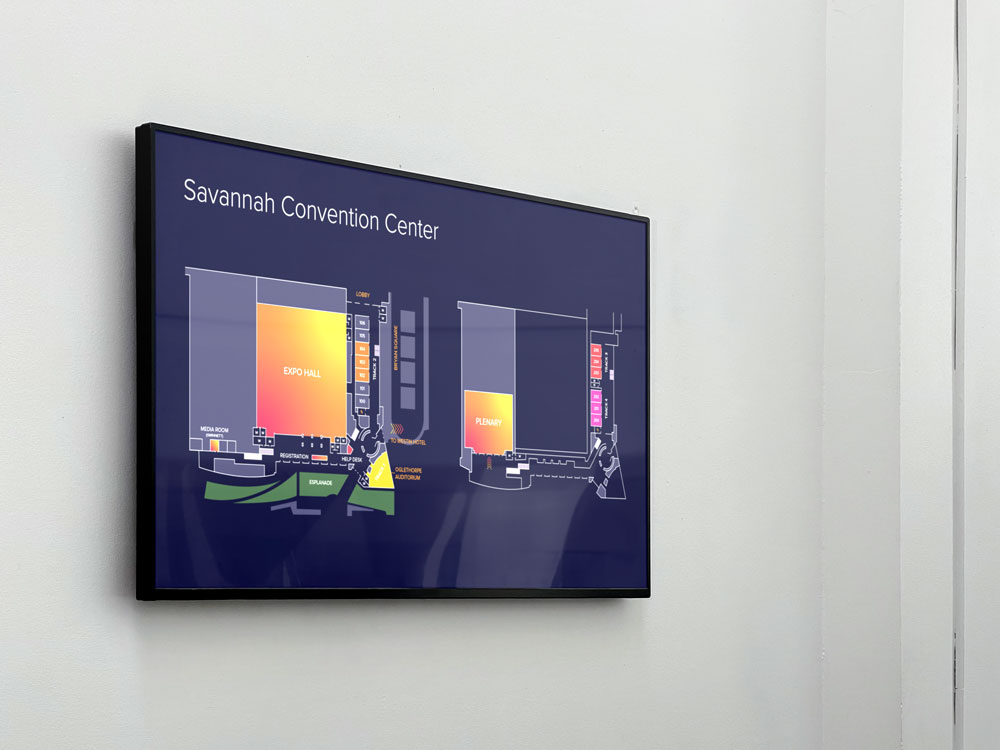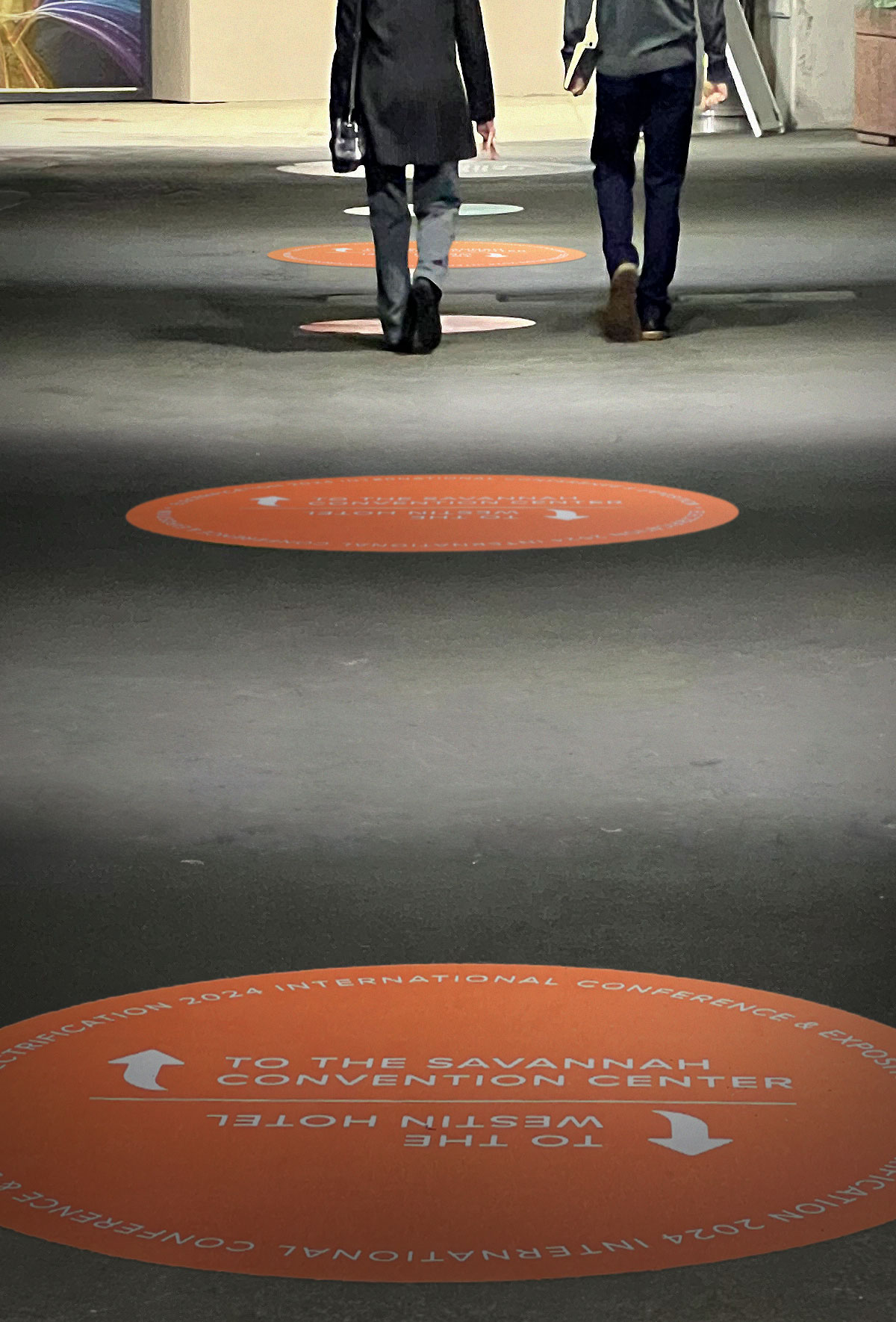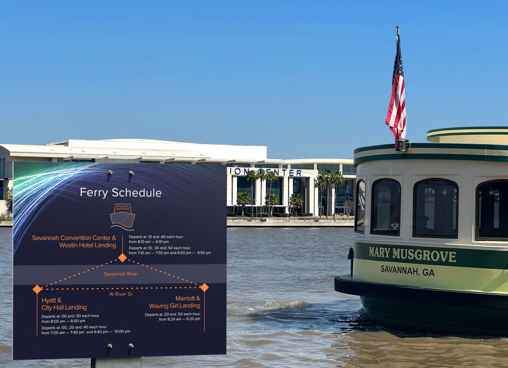 All roads led to the main entrance at the Savannah Convention Center. Depending on what side of the river attendees or exhibitors stayed, the way to the conference was by ferry, via trolley or on foot. This required a variety of wayfinding signage to make their paths easy and clear.