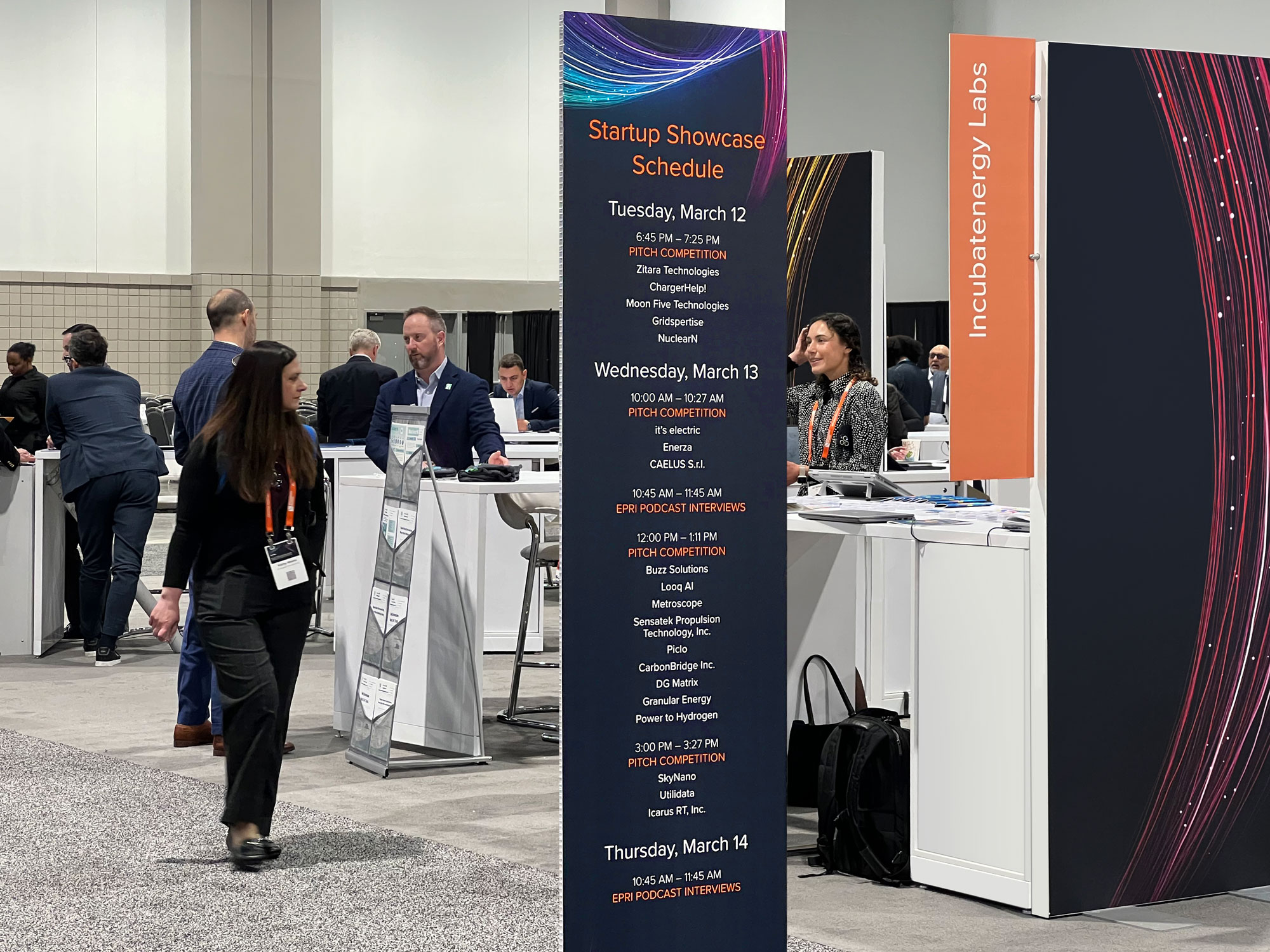 To boost innovation, EPRI featured a Startup Showcase. Out of 200 applicants, 20 of the best startups were selected to pitch their technologies on stage. They also had one‑on‑one meetings set up at their kiosks.