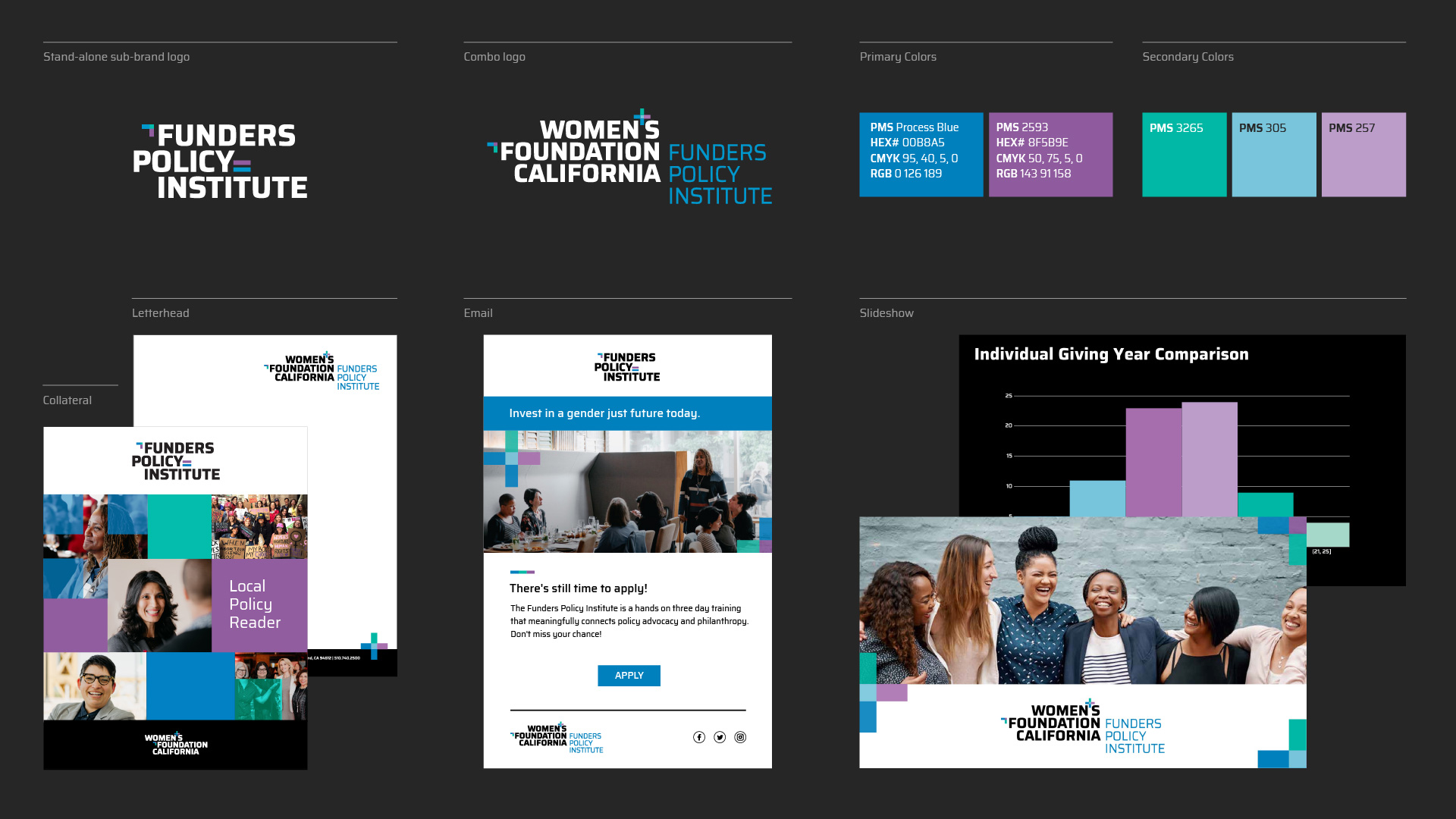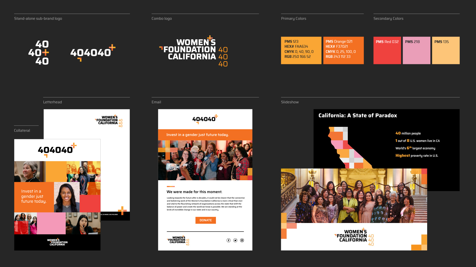 The Women’s Foundation California has always stood for inclusion, justice, and progressive legislative change on behalf of all self-identified women, trans, and gender non-conforming people everywhere. For their brand refresh, we modernized their font, deconstructed the gender symbols, and added the rainbow of color to better reflect today’s inclusive and intersectional community. We designed this update to showcase their joyful activism and create a big umbrella to visually include, welcome, and celebrate people who believe in the cause.